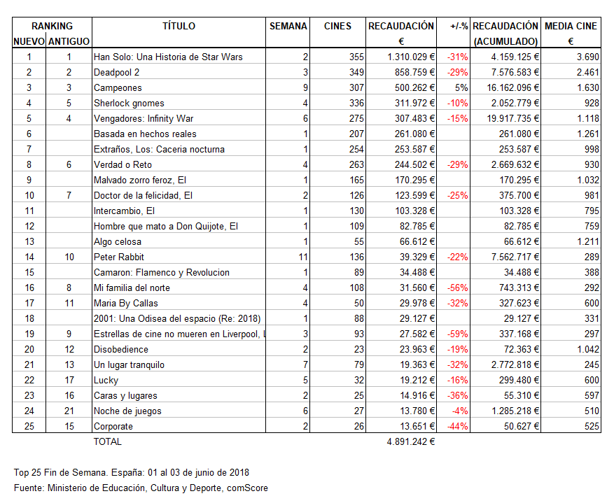 Datos Datos oficiales fin de semana del 1 al 3 junio 7 junio, 201812 junio, 2018 TaqEsp Ya tenemos disponibles los datos oficiales correspondientes al top25 de la taquilla de cine en España del fin de semana del 1 al 3 de abril Compártenos
