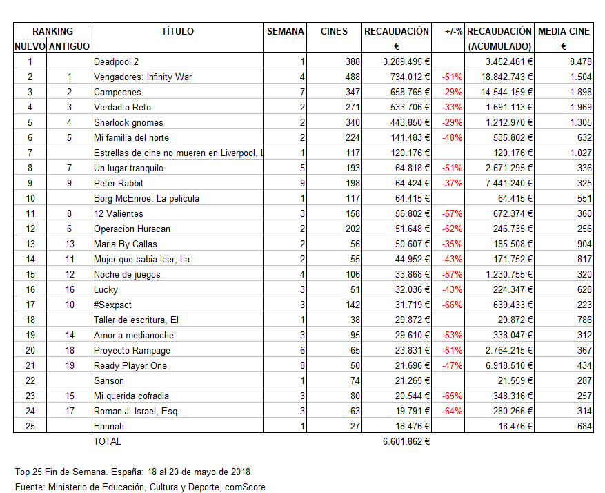 En primer lugar, Deadpool 2. En el fin de semana ha recaudado 3.29M€ y si sumamos las previas del jueves tenemos un acumulado de 3.45M€, que es parecido a lo que se estimaba que iba a recaudar. Es el tercer mejor estreno del año (míralo aquí) La primera parte de la saga obtuvo 3.51M€ en su estreno, así que se ha quedado ligeramente por debajo de esa cifra. Un buen arranque para una película que va a hacer registros ligeramente por detrás de la primera parte. Su objetivo es llegar a los 10M€, cifra que va a ser difícil de alcanzar porque la competencia es dura (hoy, 24/05, se estrena Solo y en dos semanas Jurassic World 2) y el fútbol con la final de la Champions y el Mundial parece que va a hacer mella en la recaudación total.
