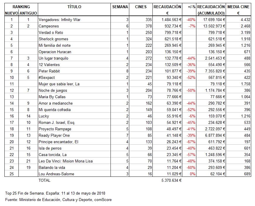 Con una recaudación casi idéntica a la de la semana anterior, hay seis estrenos que se cuelan en el top25, pero no alcanzan a las dos primeras posiciones que siguen siendo Vengadores: Infinity War y Campeones. Son las dos películas más taquilleras de lo que va de año. Enhorabuena por ellas.