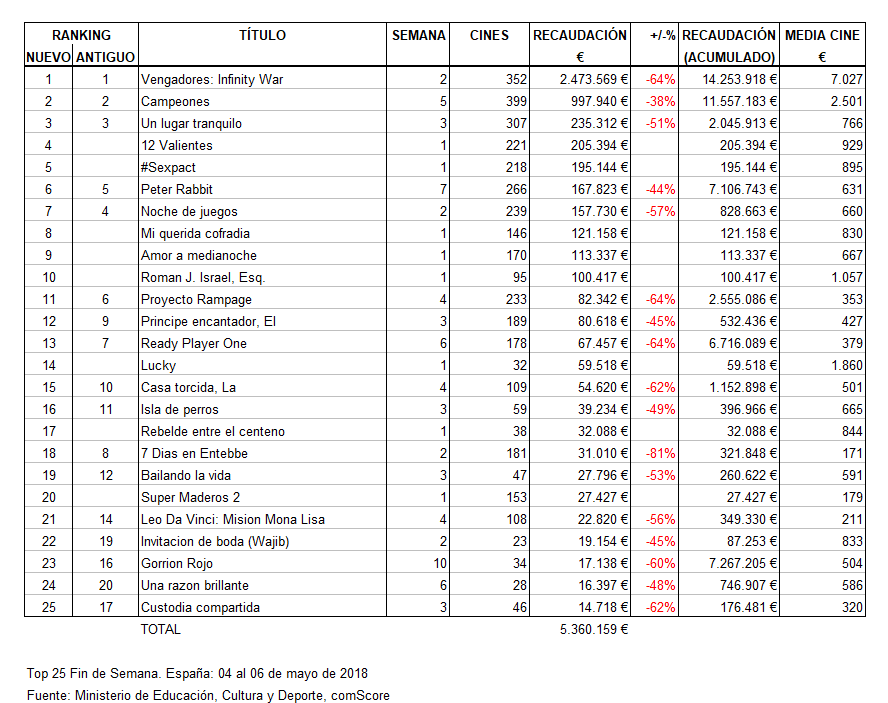 Ya tenemos disponibles los datos oficiales del top 25 de la taquilla en España correspondientes al fin de semana del 4 al 6 de mayo