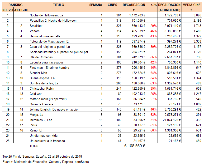 Datos Top25 OFICIAL 26 al 28 octubre 1 noviembre, 20185 noviembre, 2018 TaqEsp A continuación, el ránking completo de la taquilla de cine correspondiente al fin de semana del 19 al 21 de octubre: Compártenos