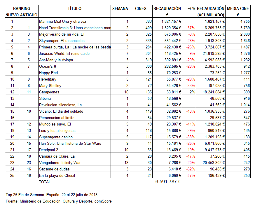 Datos Top25 OFICIAL Fin de semana 20 al 22 de julio 26 julio, 201830 julio, 2018 TaqEsp A continuación, el top25 oficial correspondiente a la taquilla de cine del fin de semana del 20 al 22 de julio Compártenos