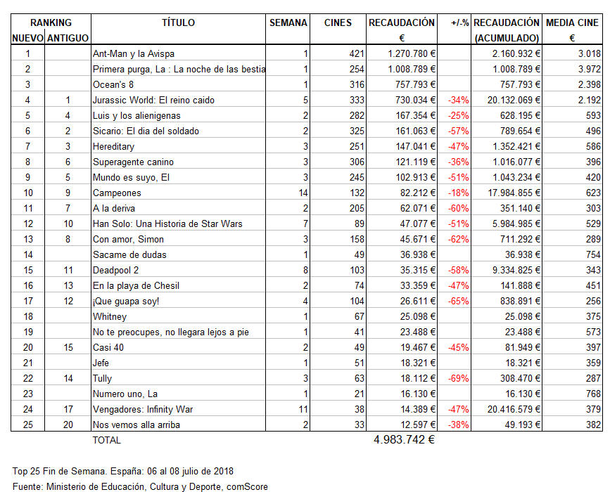 Datos Top25 OFICIAL fin de semana del 6 al 8 julio 12 julio, 201820 julio, 2018 TaqEsp A continuación os incluimos el top25 oficial correspondiente a la taquilla de cine en España del 6 al 8 julio Compártenos