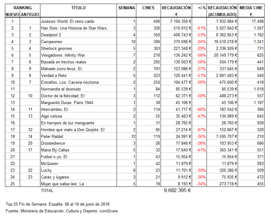Ya tenemos disponibles los datos del top25 de la taquilla de cine en España correspondiente al fin de semana del 8 al 10 de junio