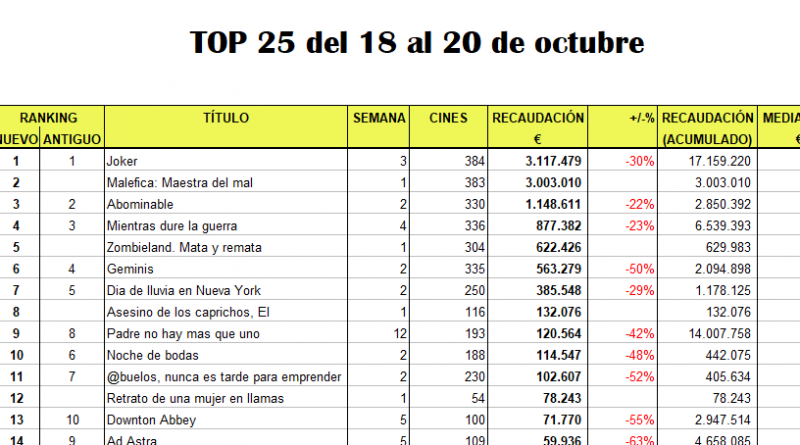 A continuación, el ránking completo de la recaudación correspondiente al fin de semana del 18 al 20 de octubre: