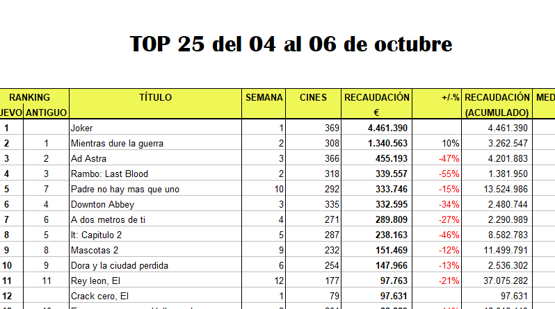 Los datos completos correspondientes a la recaudación en taquilla del fin de semana del 4 al 6 de octubre son: