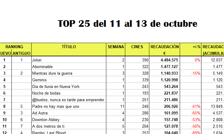 A continuación, el ránking completo de la recaudación correspondiente al fin de semana del 11 al 13 de octubre: