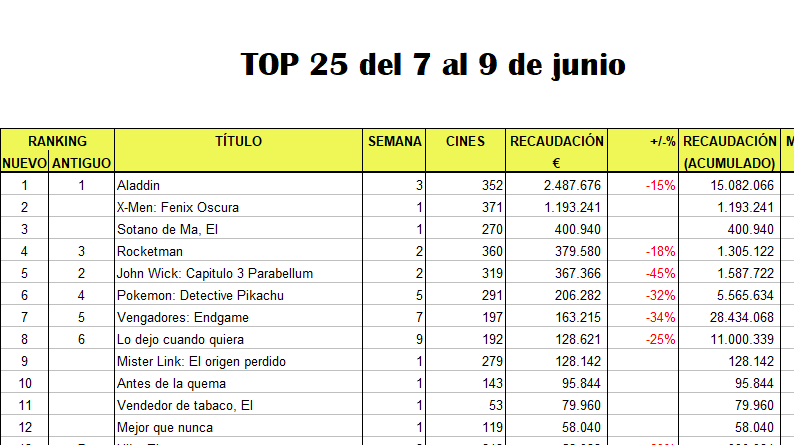 A continuación los datos completos correspondientes a la recaudación en España del fin de semana del 7 al 9 de junio de 2019