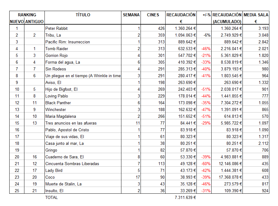 Datos Taquilla fin de semana 23 al 25 de marzo