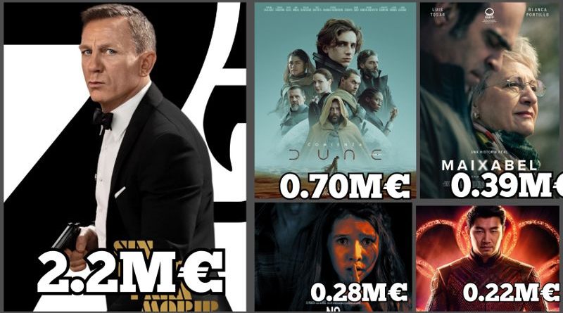 Segundo mejor estreno del año para la última película de Bond con 2.2M€. Si bien es cierto que el viernes no fue su mejor día (hizo peores registros en viernes que Dune, Viuda Negra, ShangChi…) pero el sábado y domingo fueron mucho mejores y eso hizo que recuperara posiciones hasta ese segundo puesto. Se queda lejos del dato de Fast & Furious 9 (2.80M€), pero estos 2.2M€ son más que buenos y se quedan cerca de lo que hizo Spectre (2.85M€) en 2015.
