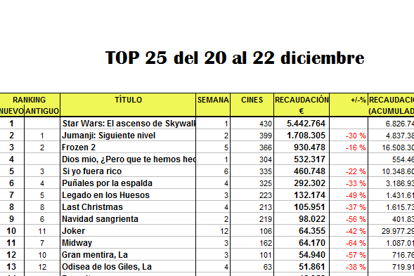 Ya disponemos de los datos completos de recaudación de taquilla del fin de semana del 20 al 22 de diciembre: