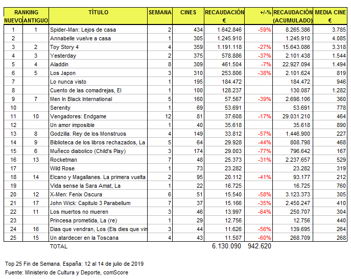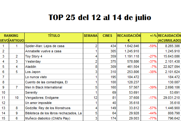 Datos Top COMPLETO 12 al 14 julio 17 julio, 201924 julio, 2019 TaqEsp A continuación, el ránking completo correspondiente al fin de semana del 12 al 14 de julio: ◄ Fin de semana anterior Fin de semana posterior► Compártenos