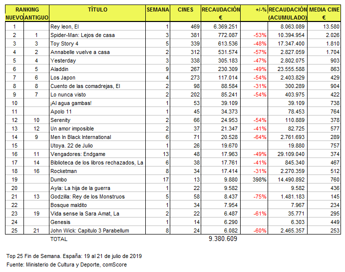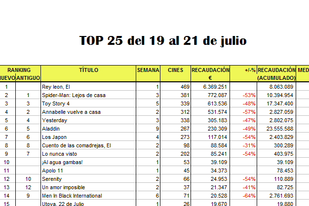 Datos Top COMPLETO 19 al 21 julio 24 julio, 20191 agosto, 2019 TaqEsp A continuación, el ránking completo del fin de semana del 19 al 21 de julio: ◄ Fin de semana anterior Fin de semana posterior ► Compártenos