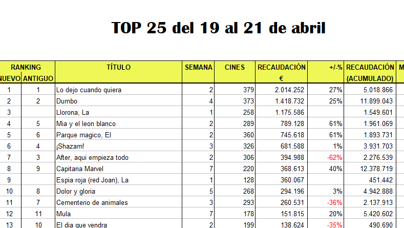 Ya disponemos, unos días más tarde de lo habitual, de las cifras correspondientes al fin de semana del 19 al 21 de abril
