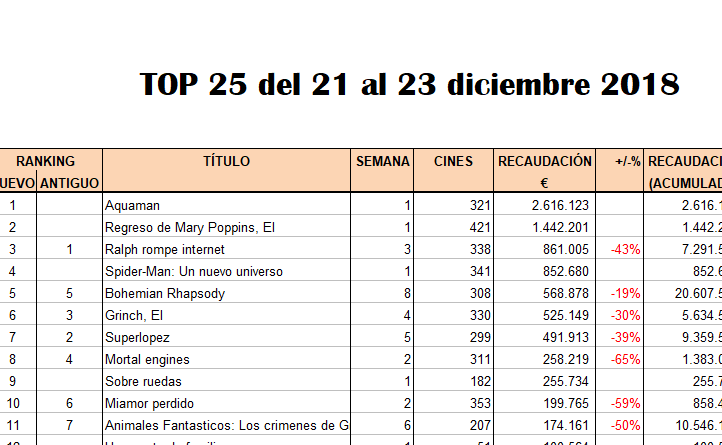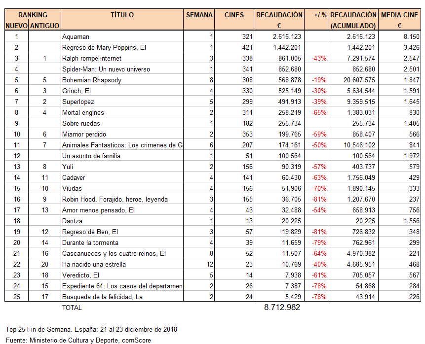 Datos Top25 COMPLETO 21 al 23 diciembre 27 diciembre, 201831 diciembre, 2018 TaqEsp A continuación os incluimos el cuadro completo correspondientes a las 25 películas que más han recaudado en el fin de semana del 21 al 23 de diciembre: Compártenos