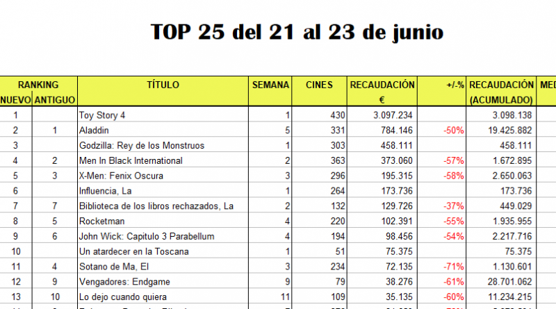 A continuación, los datos completos correspondientes a la recaudación en España del fin de semana del 21 al 23 de junio de 2019