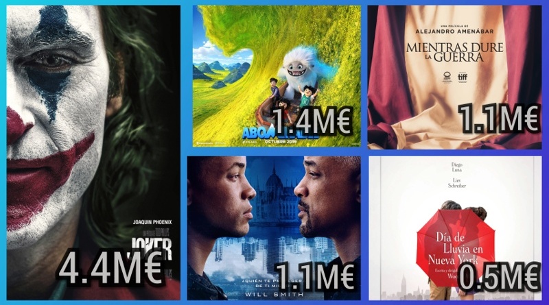 Discreto comienzo de la película de Will Smith con 1.1M€. Tanto a nivel nacional como internacional. El enorme éxito del Joker ha afectado a la cinta. Tendrá que luchar para llegar a los 3M€. Su alto presupuesto de 138M$ va a hacer muy difícil su amortización.