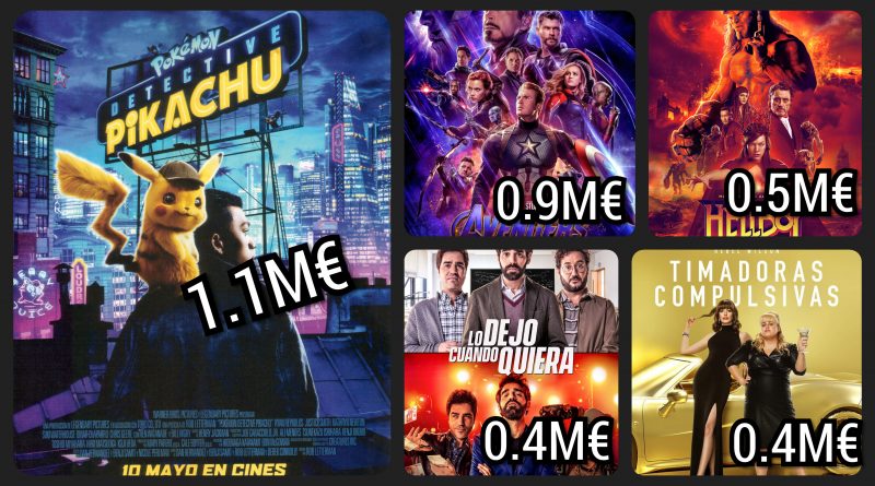 Repite en primera posición Detective Pikachu con algo más de 1.1M€, lo que supone una caída aproximadamente del 40%. Su acumulado se estima en unos 3.7M€. Buenos datos para la cinta cuyo final estaría en el entorno de los 7M€, aunque esta próxima semana con Aladdín va a sufrir.